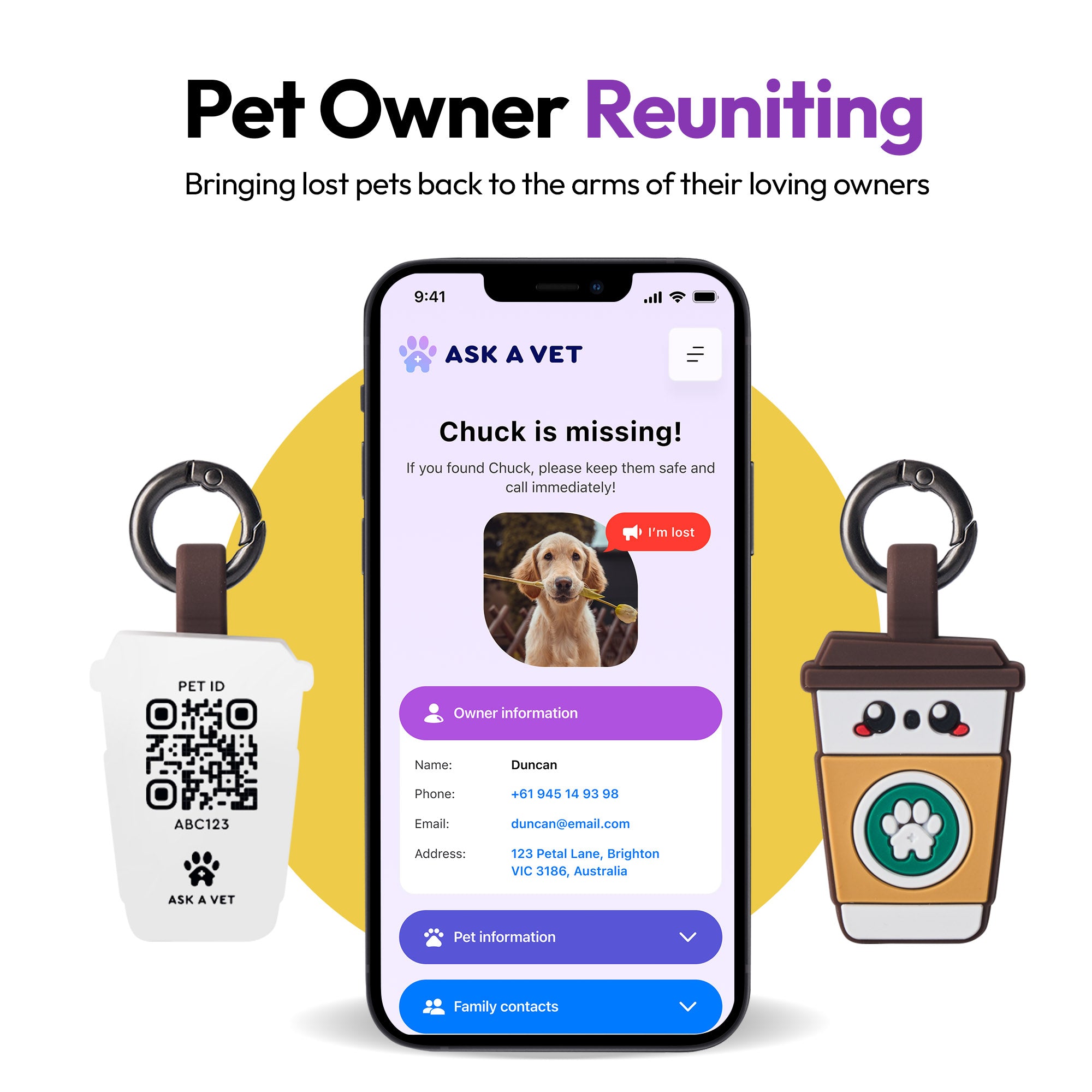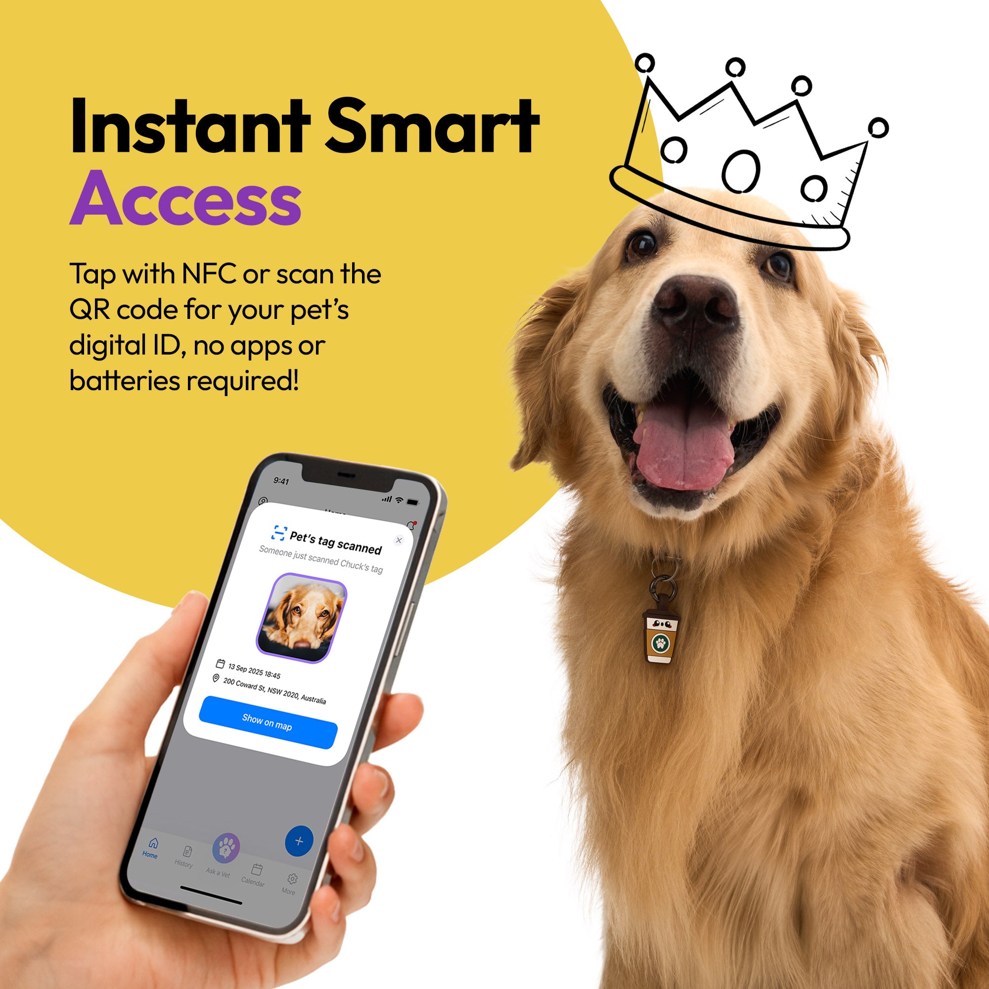 - 📱 Smart Pet ID: Online profile stores emergency info, allergies, vet records, and more.