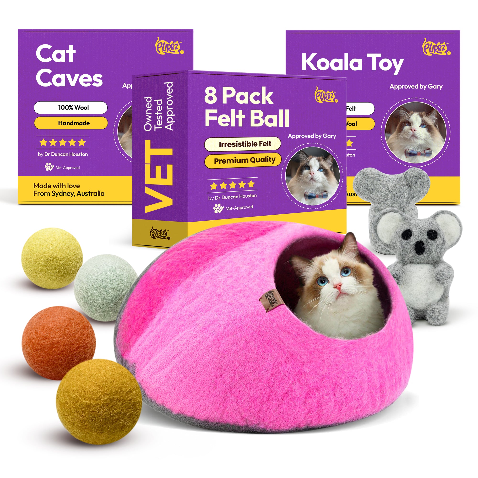 The PURRZ Handmade Romance Bundle is a thoughtfully curated collection of handcrafted, natural, and vet-designed essentials for cats who deserve something truly special. Every item in this bundle is made from 100% natural New Zealand merino wool, combining calming comfort, gentle enrichment, and ethical craftsmanship.