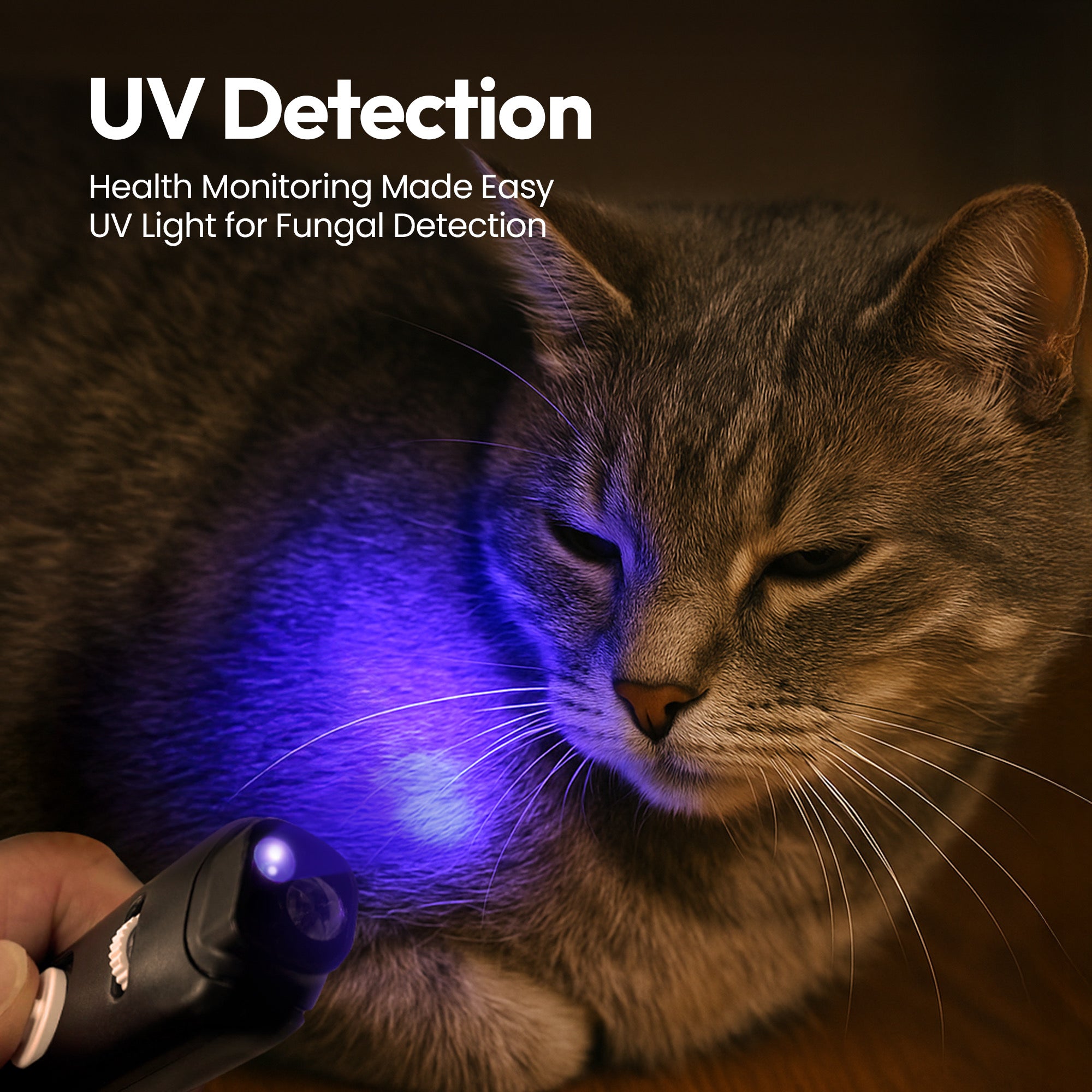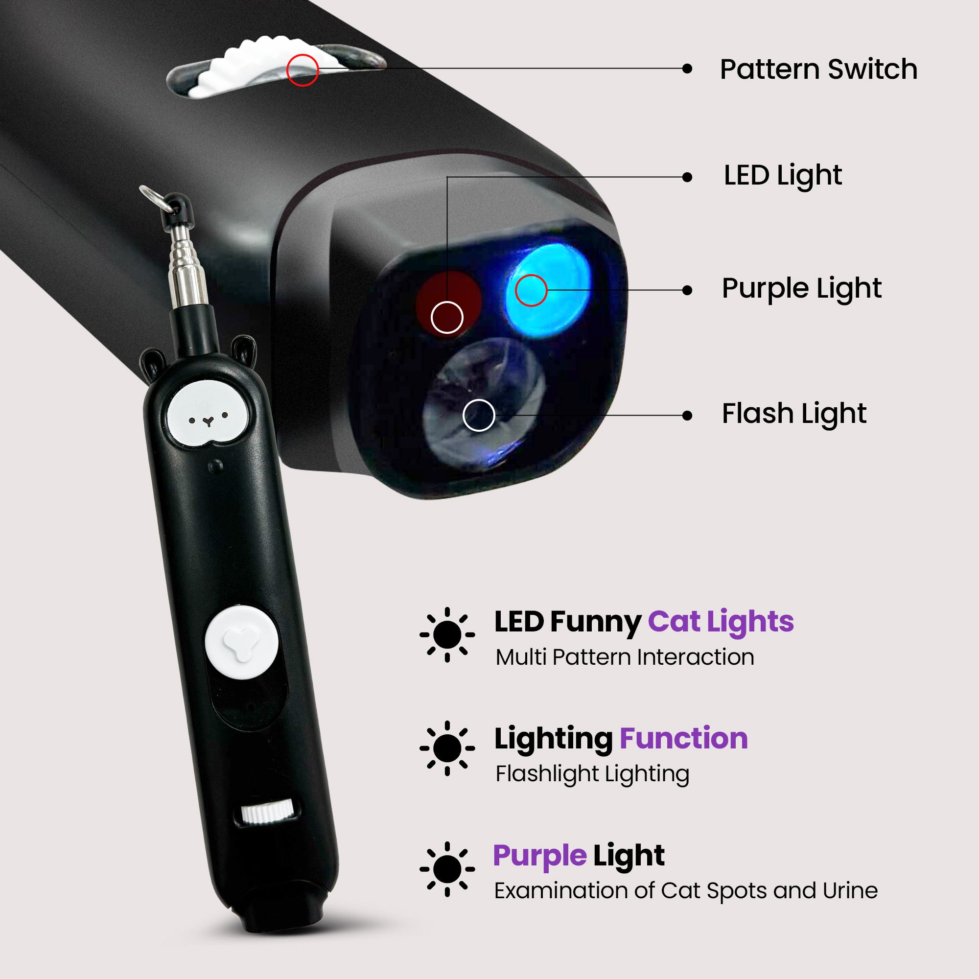 Activate your cat’s natural predator instincts with a bright red laser for interactive chasing, pouncing, and zoomies. Perfect for cardio, agility, and fun! 💨😻 - 🟣 UV Health Detection Light