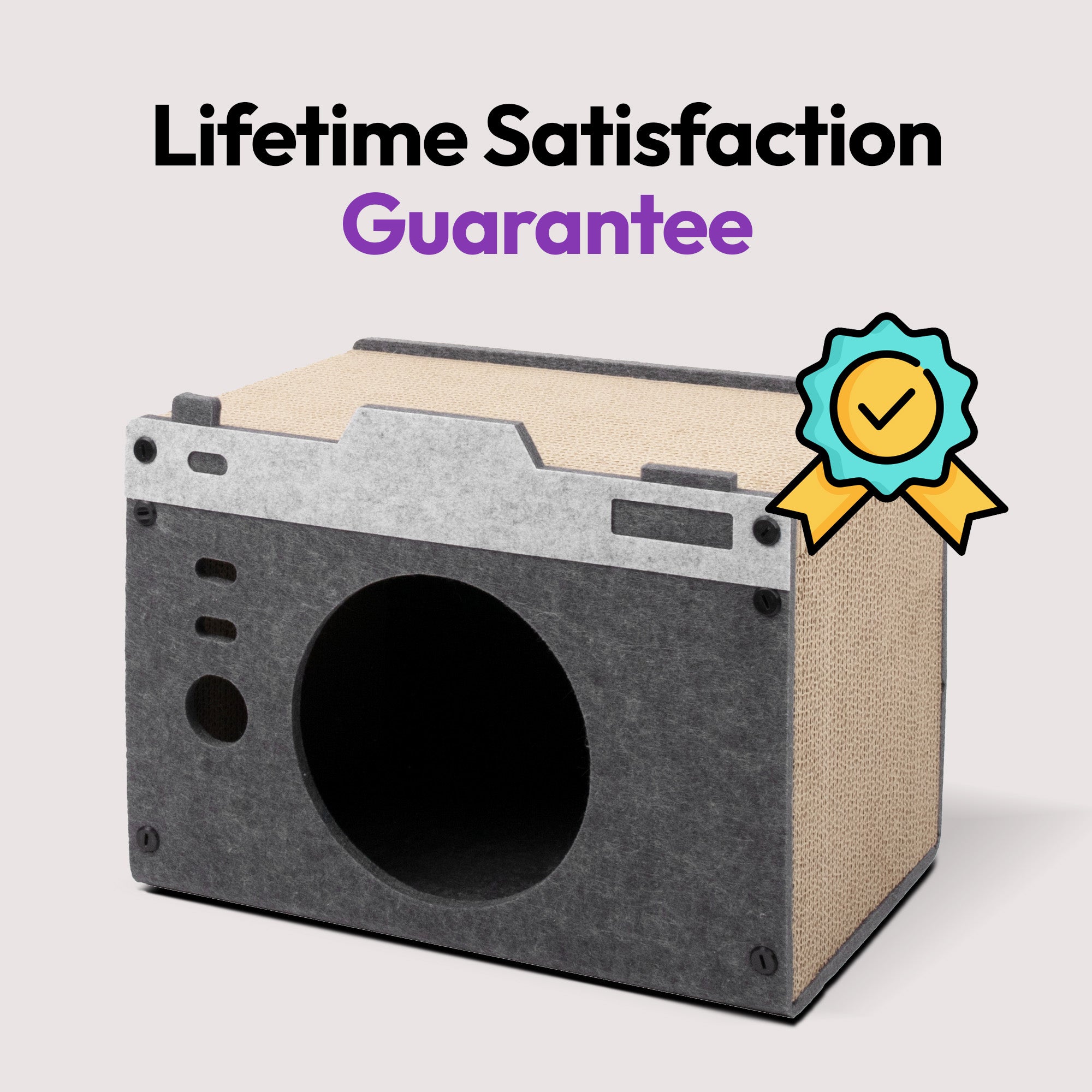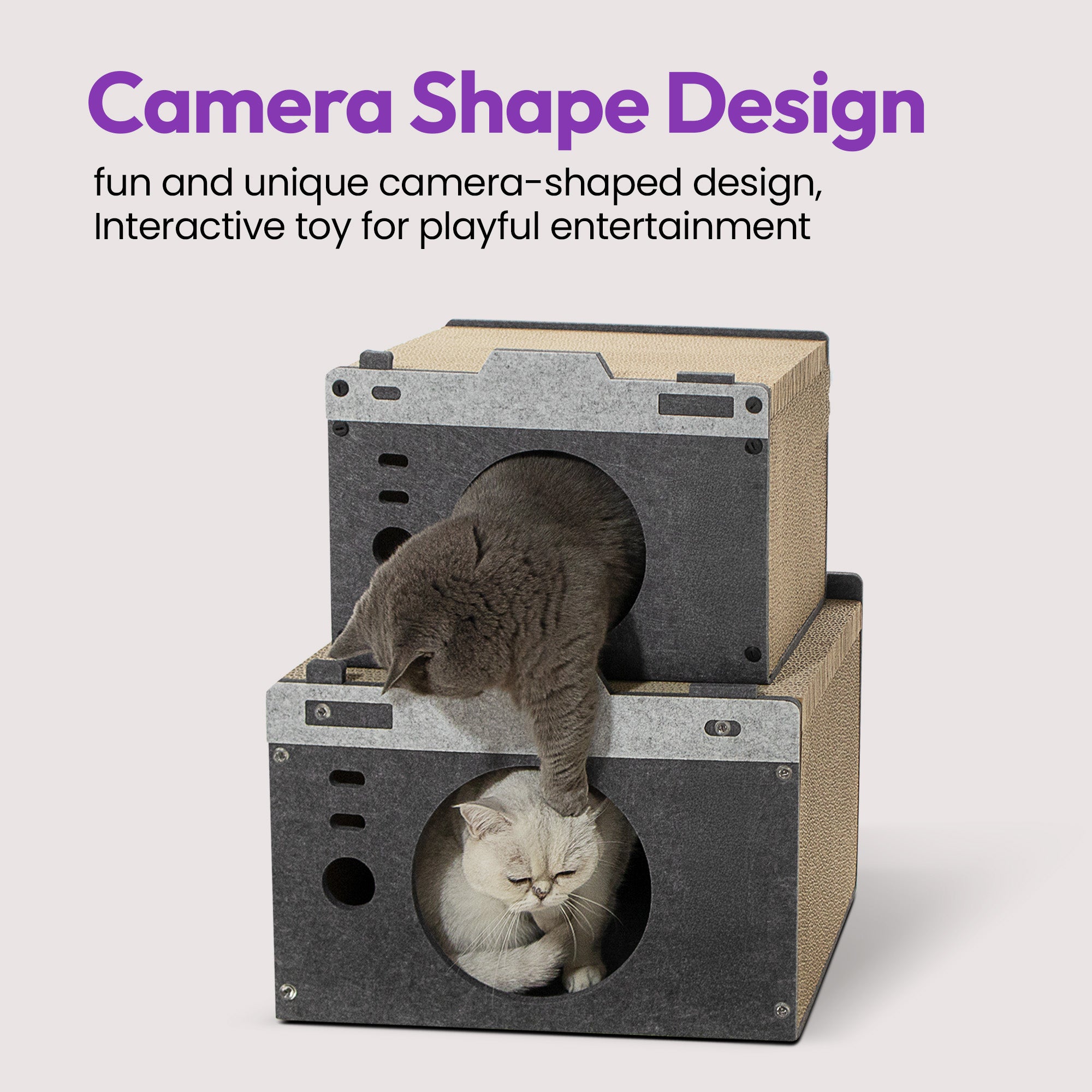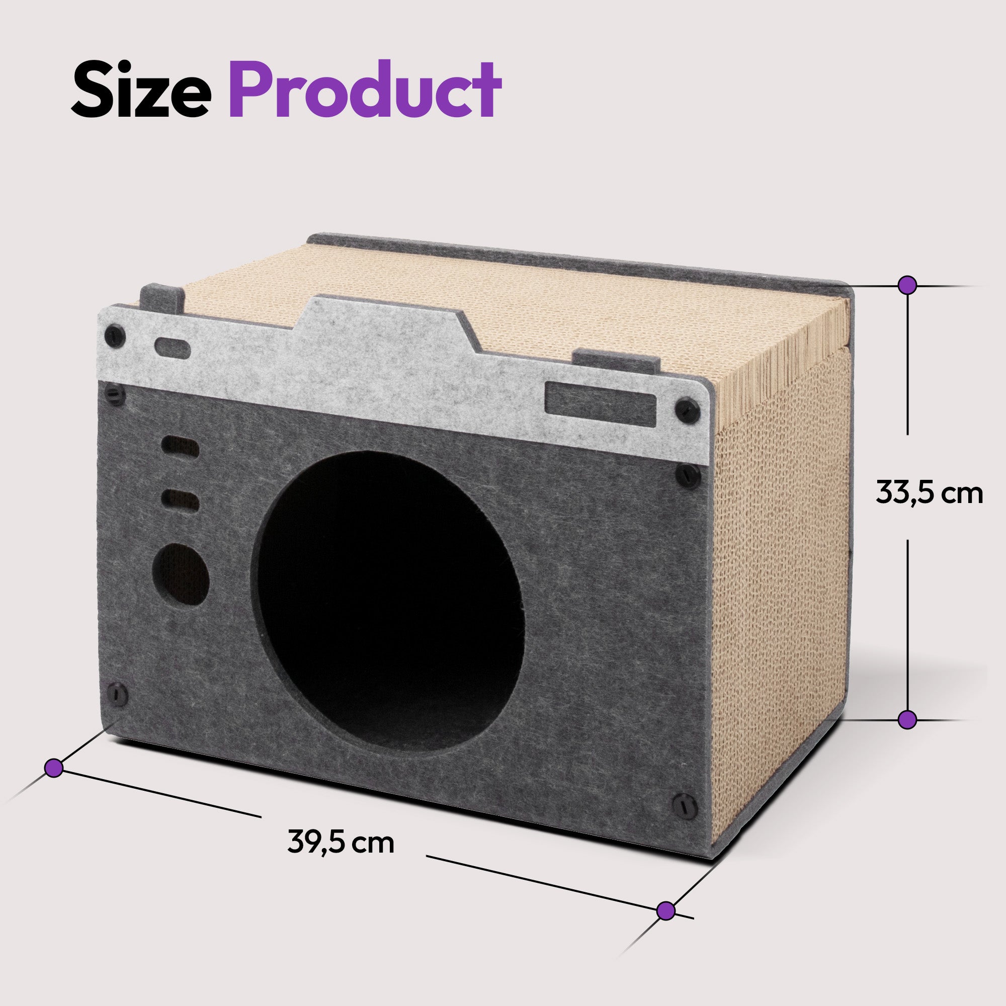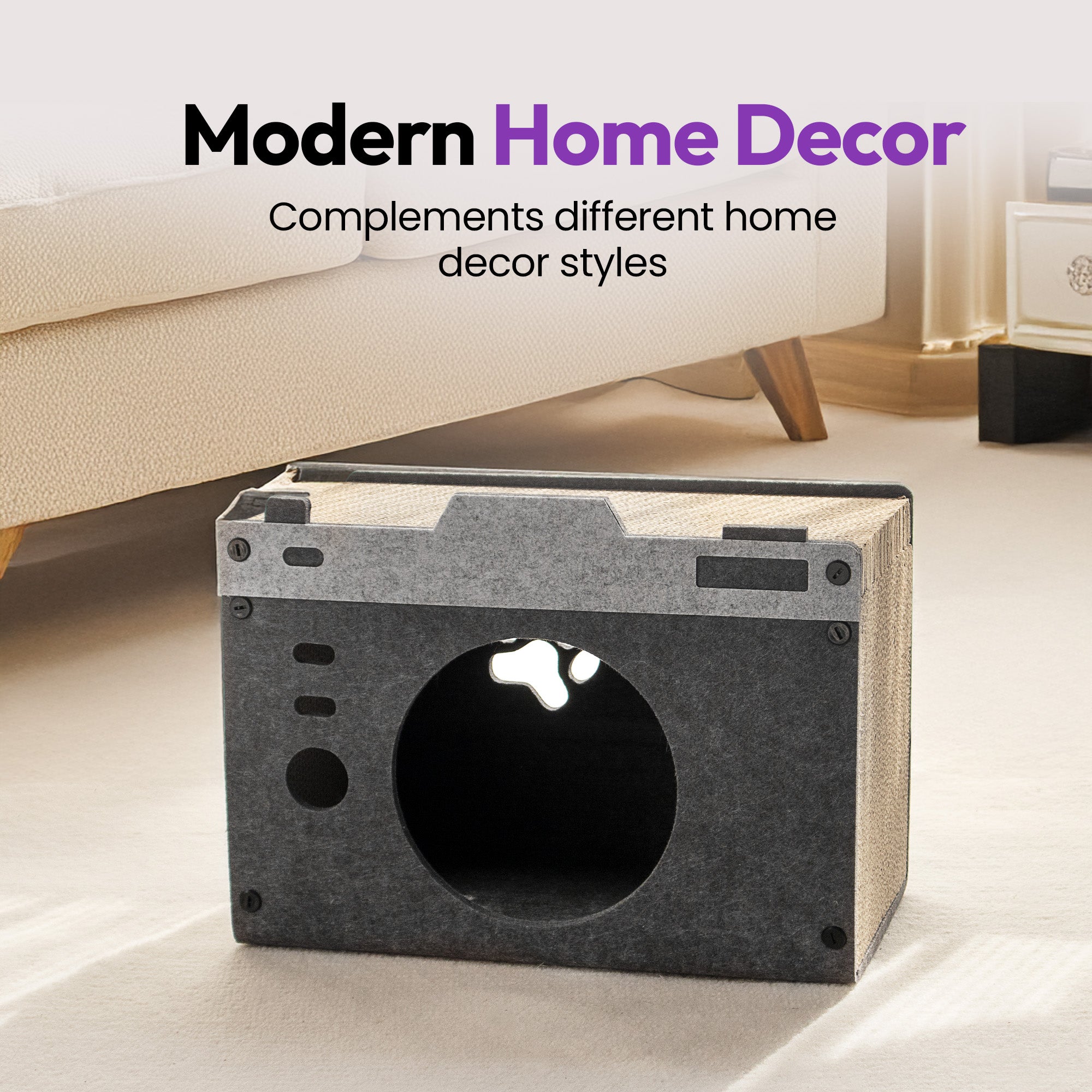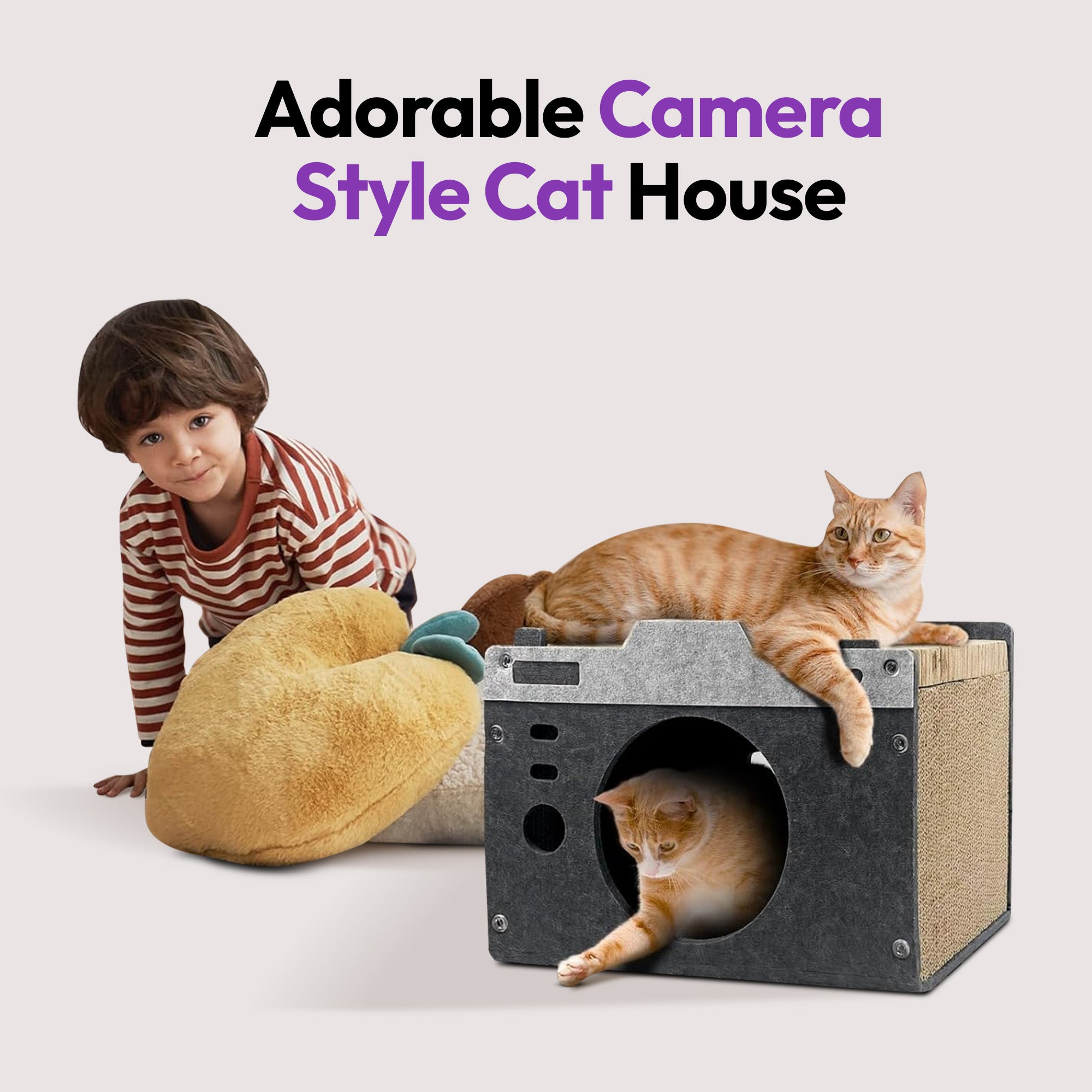 Camera-shaped cat scratcher house with soft felt walls and durable cardboard floor. A cozy, stylish hideaway for cats to scratch, nap, and play.