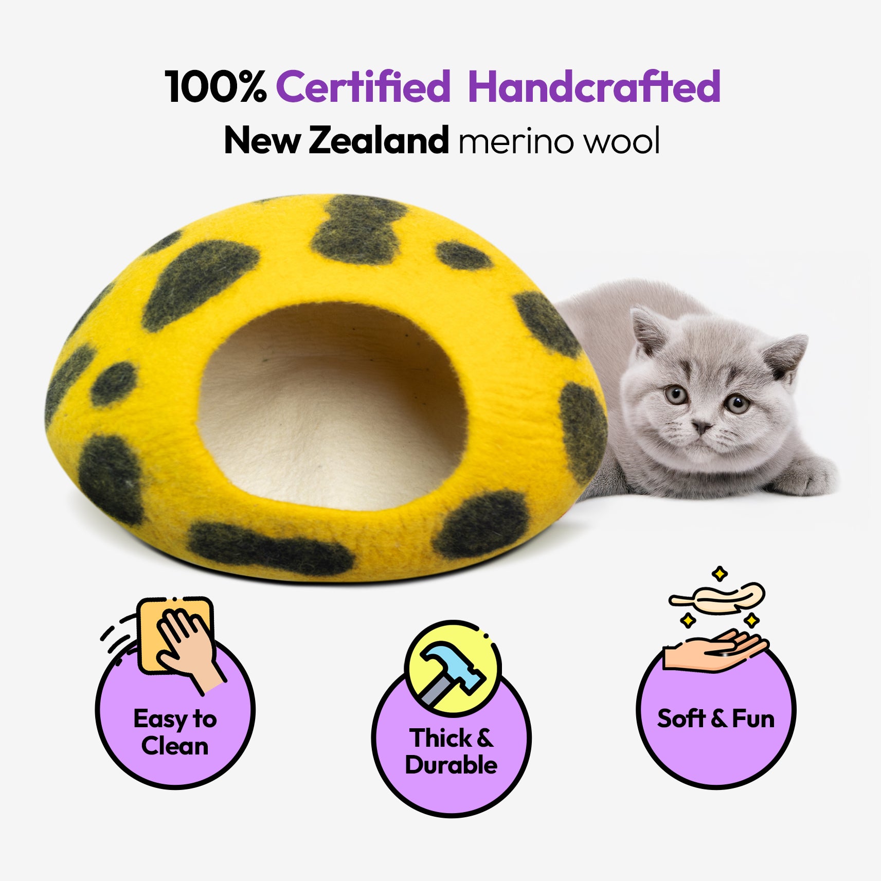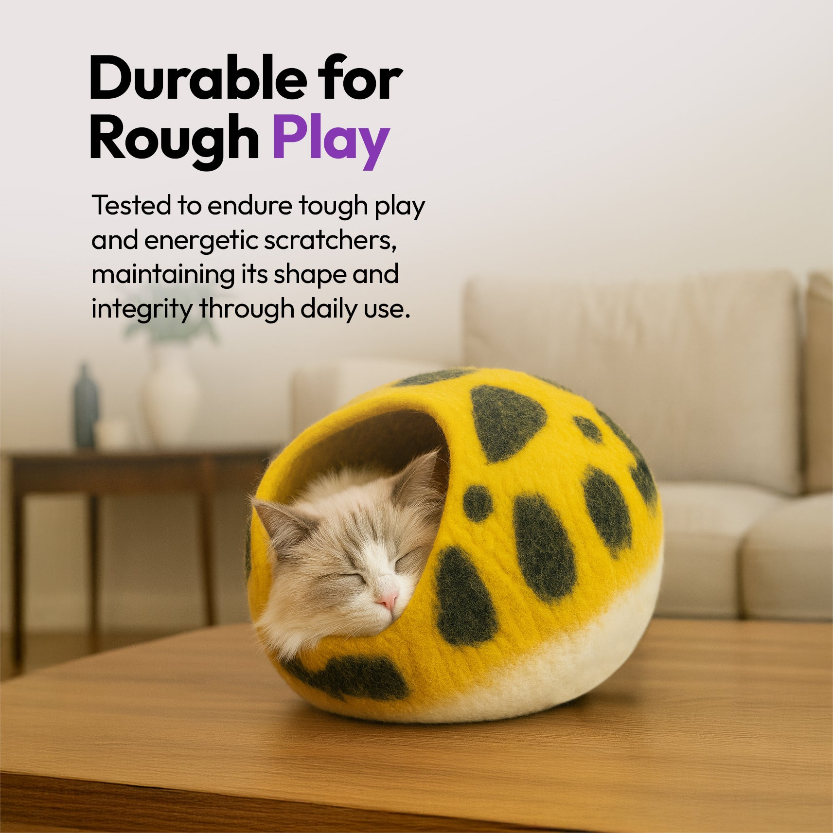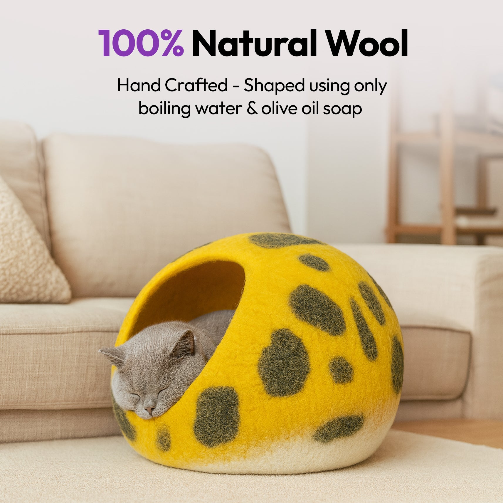 Wool keeps cats warm in winter and cool in summer—perfect for all climates and indoor environments.