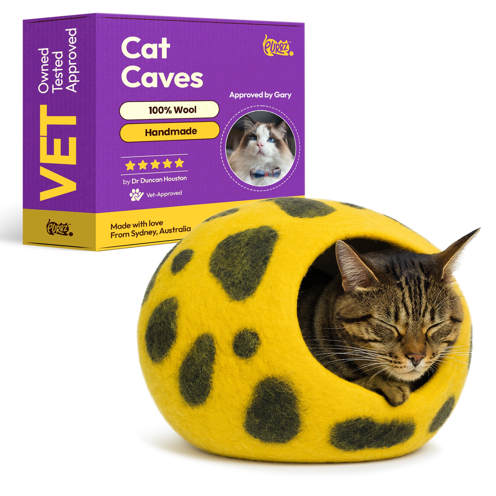 Handmade from 100% natural merino wool, this cozy, hypoallergenic cat cave offers a calming, enclosed hideaway for cats and small pets. Vet-designed to reduce anxiety and promote restful sleep, it blends modern style with sustainable craftsmanship.