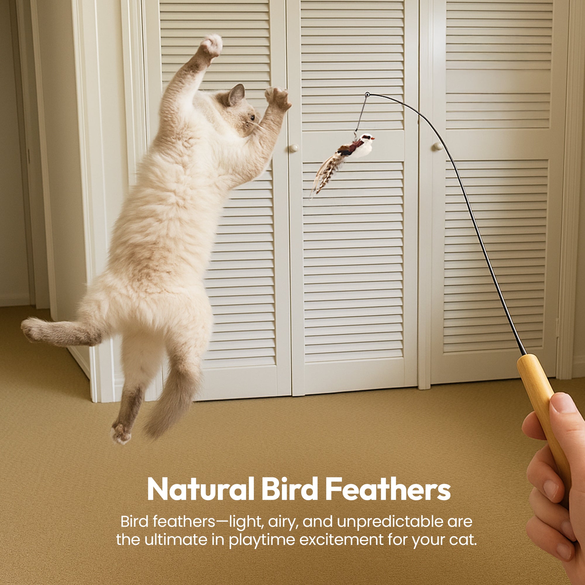 Switch up playtime with three different natural feather attachments – each with its own texture, flutter, and excitement! No more toy boredom. 😻