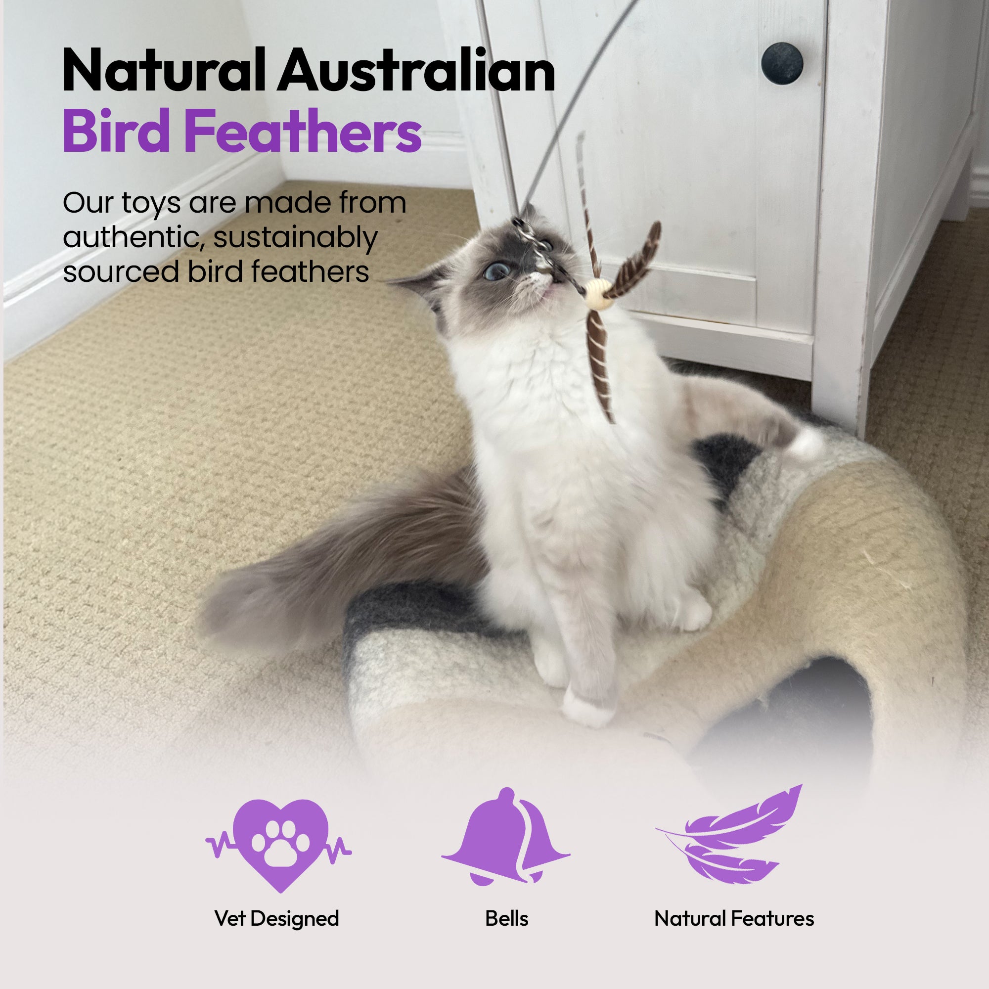 Awaken your cat’s wild instincts with the PURRZ Kookaburra Feather Wand Toy – an elegant, interactive teaser inspired by the earthy tones and fluttering flight of Australia’s iconic kookaburra. 🇦🇺🦜 Created by Dr. Duncan Houston (BVSc), this wand toy mimics the natural motion of prey, encouraging your cat to jump, chase, and pounce like the predator they are! 🎯🐾