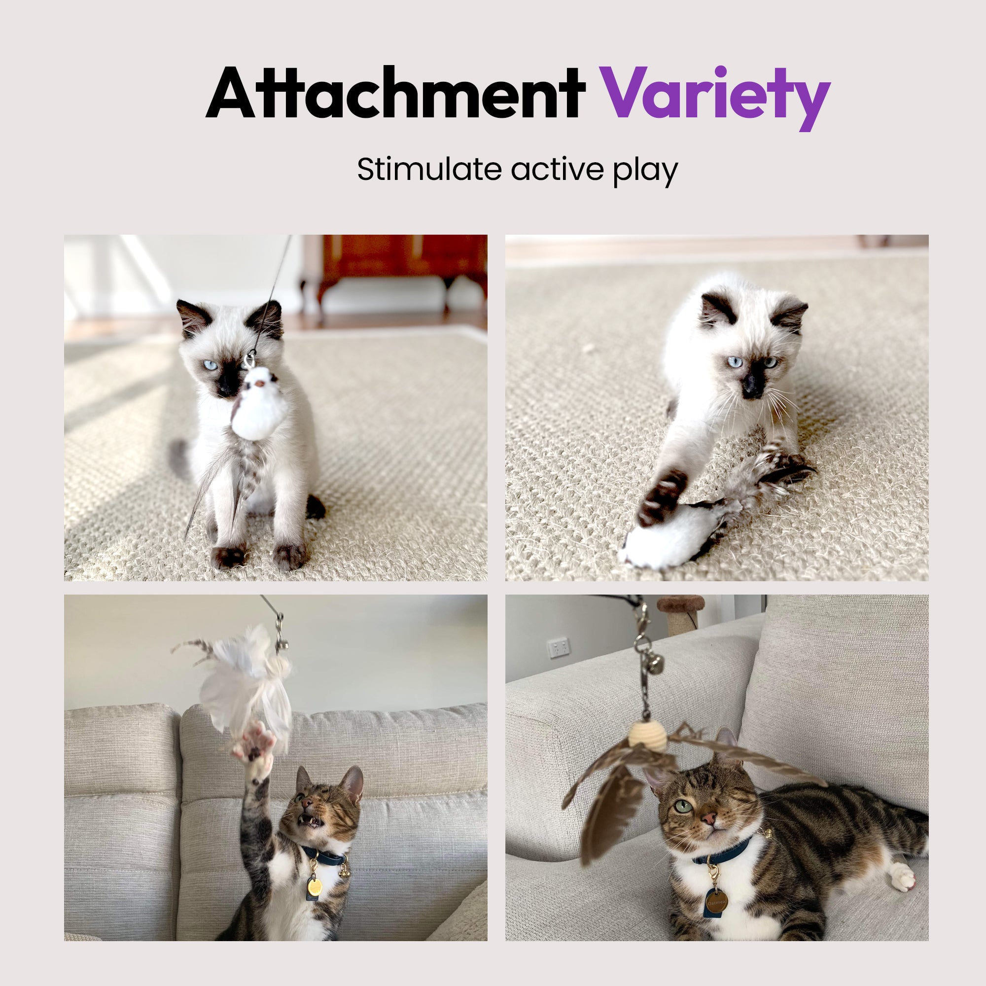 • ✔️ 3 Interchangeable Feather Toys 🔁