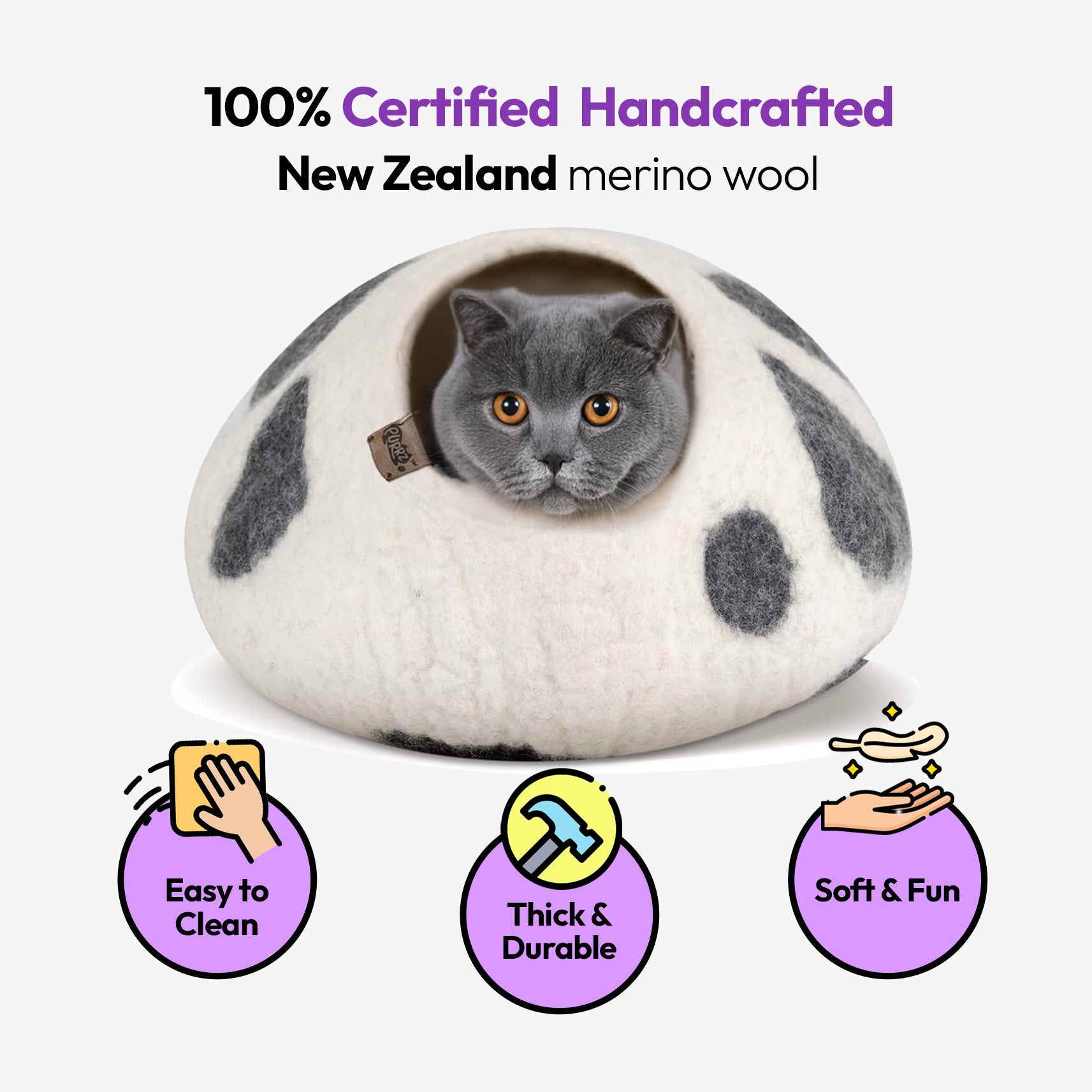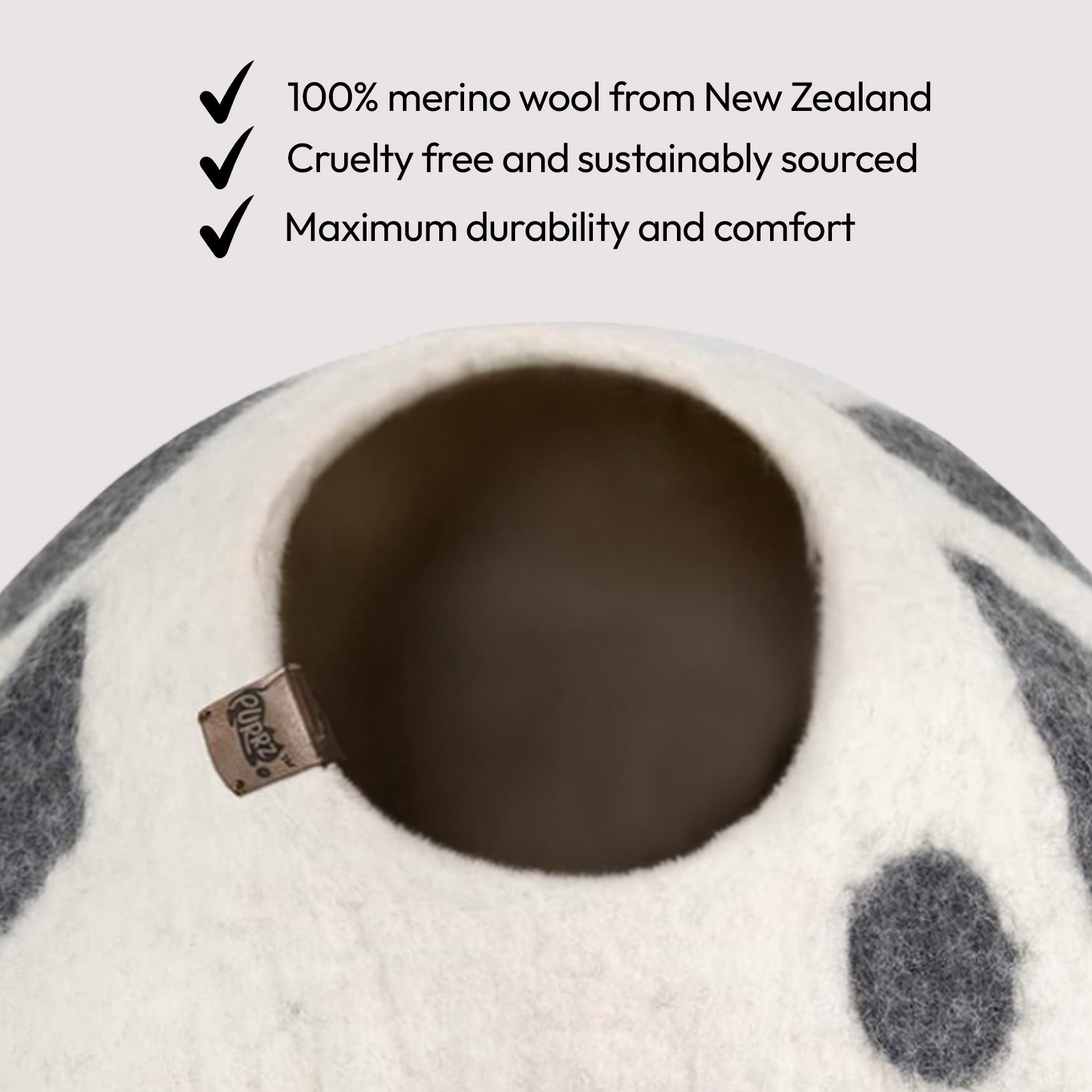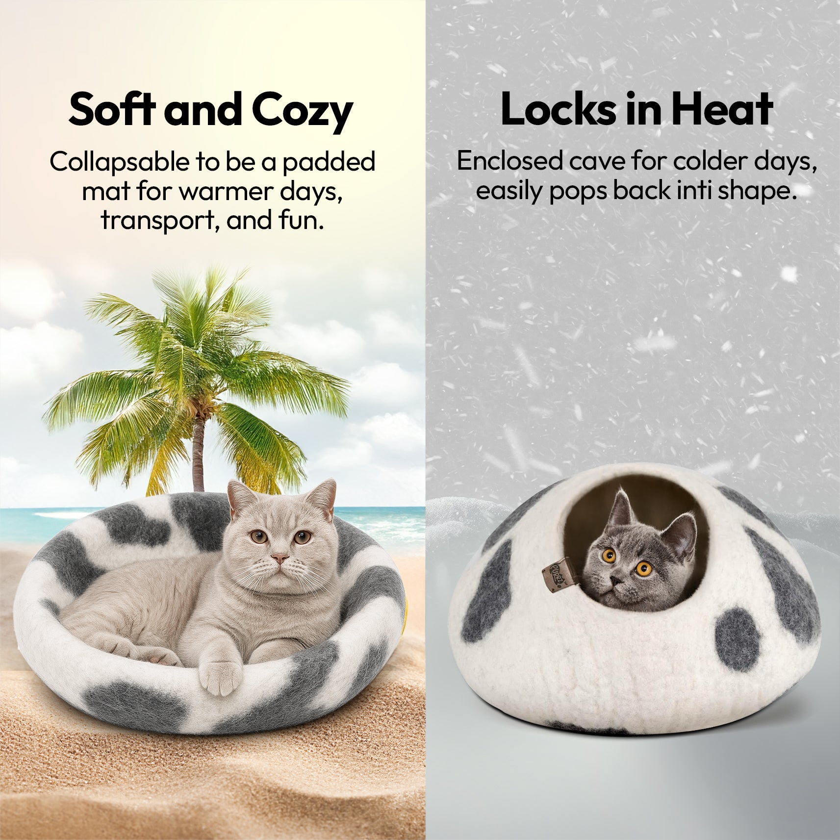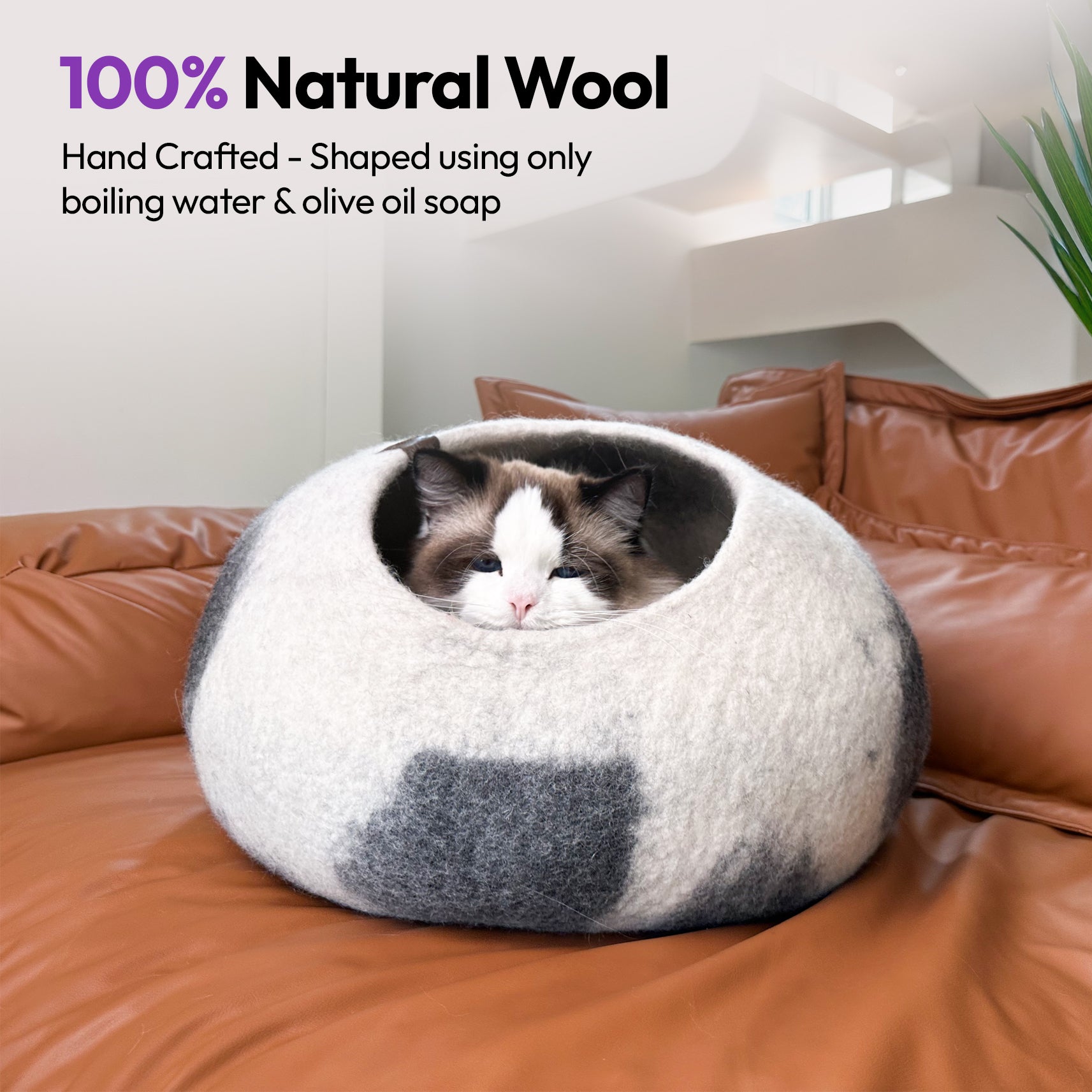 Wool keeps cats warm in winter and cool in summer—perfect for all climates and indoor environments.