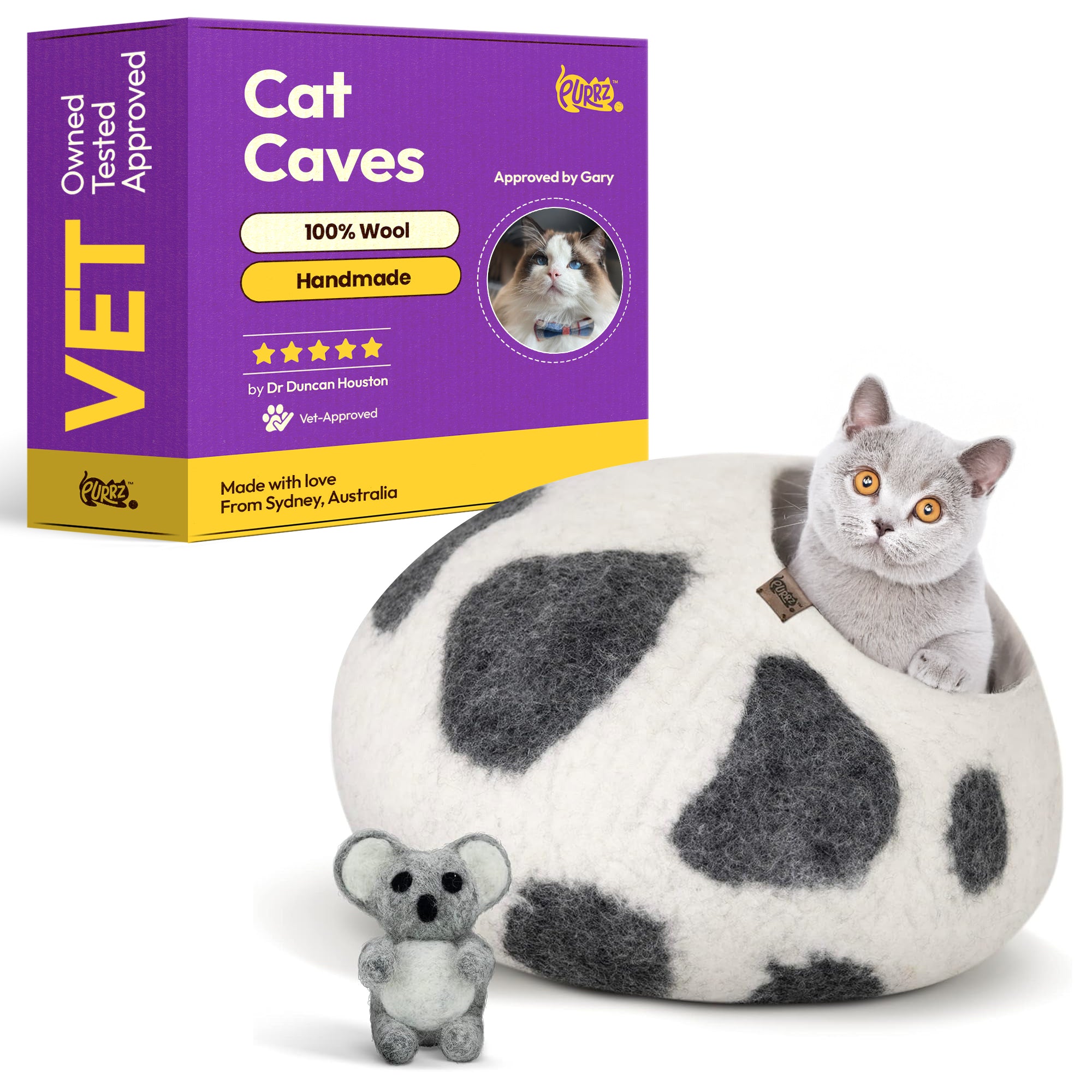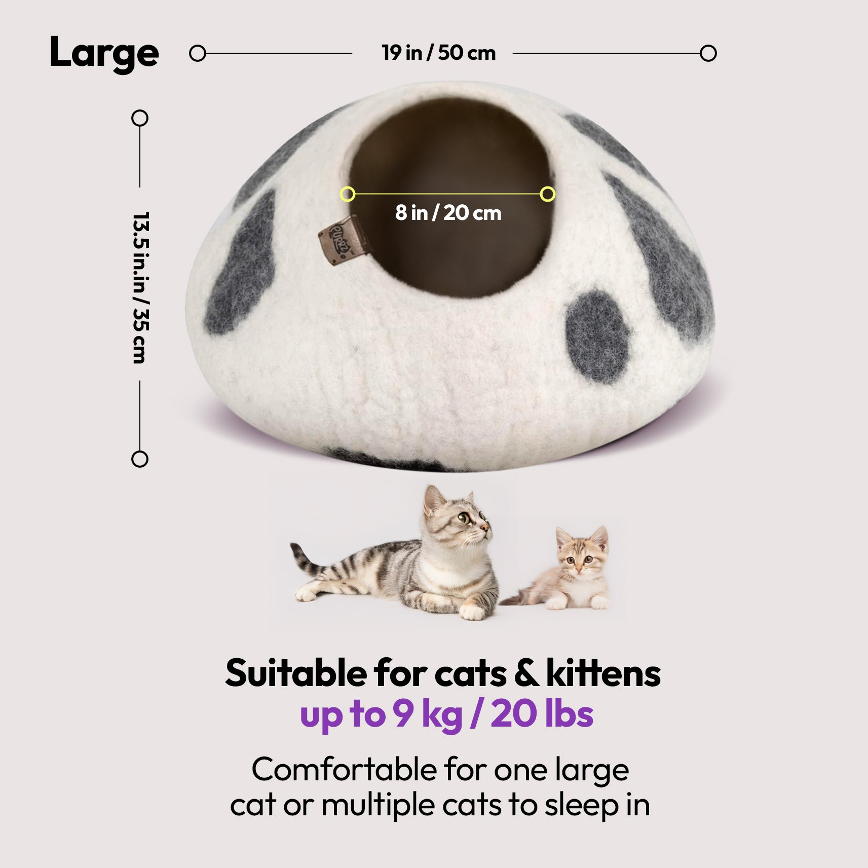 Handmade from 100% natural merino wool, this cozy, hypoallergenic cat cave offers a calming, enclosed hideaway for cats and small pets. Vet-designed to reduce anxiety and promote restful sleep, it blends modern style with sustainable craftsmanship.