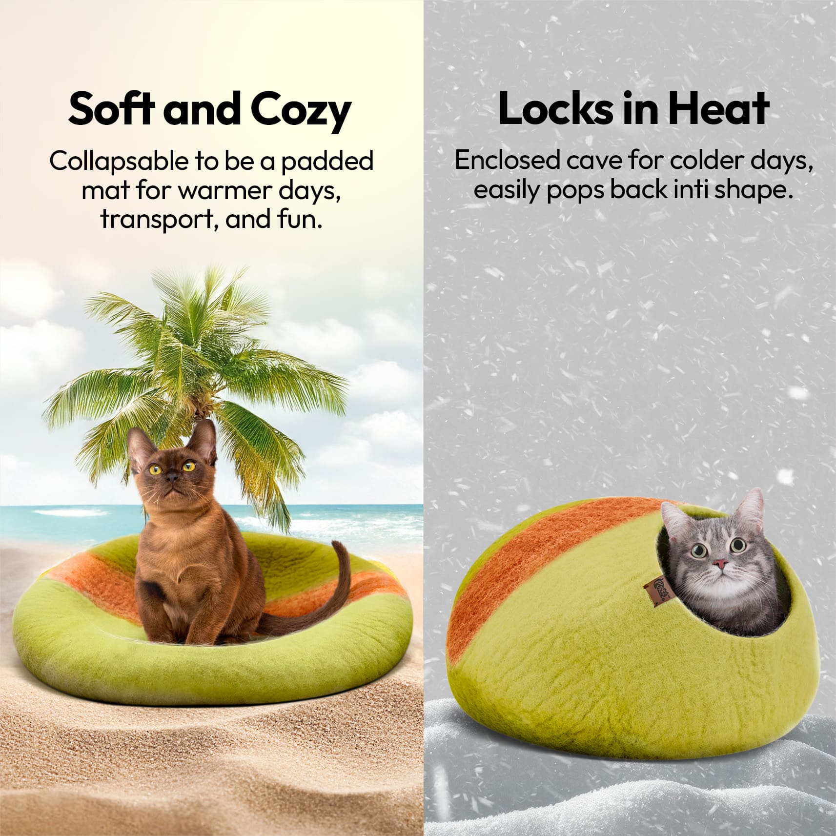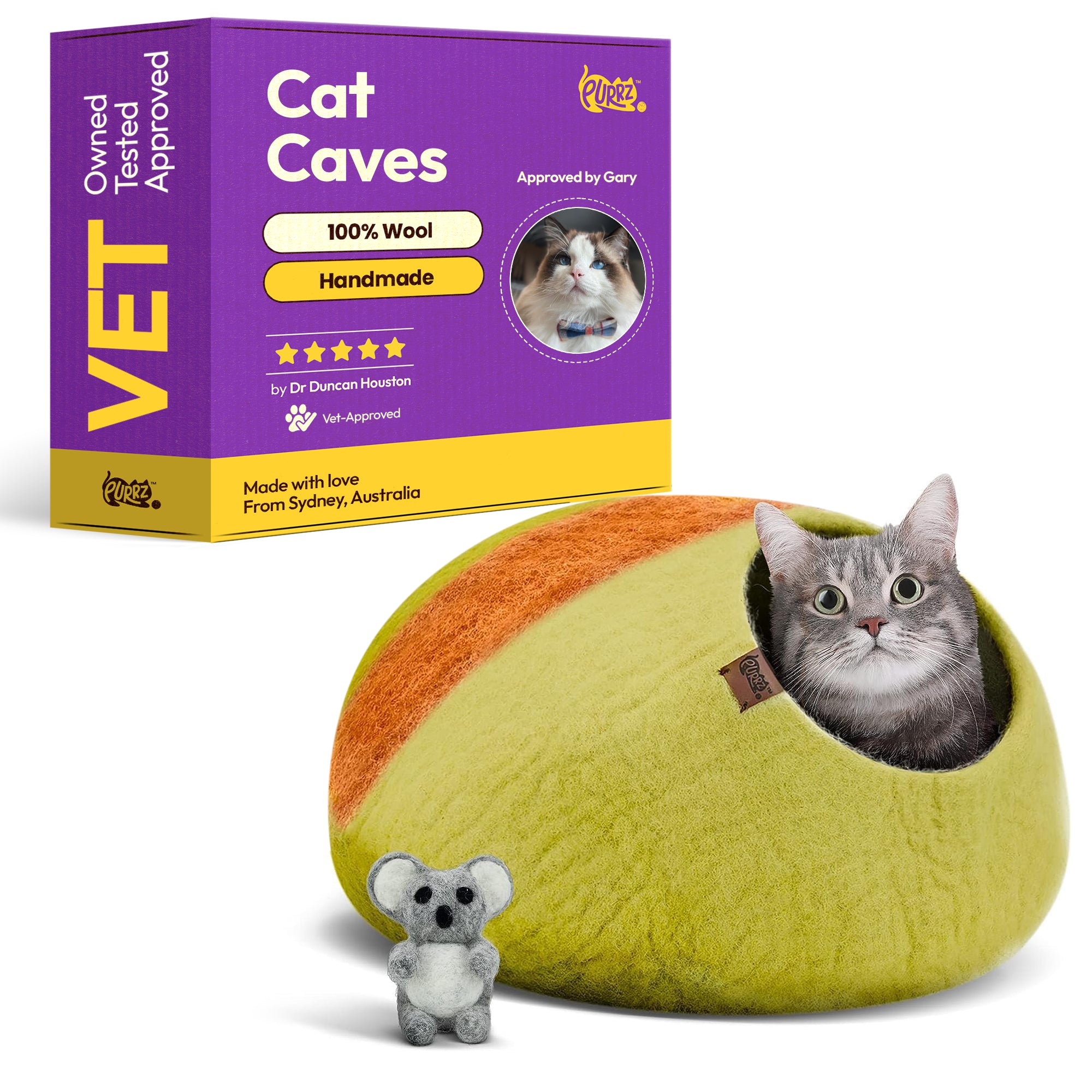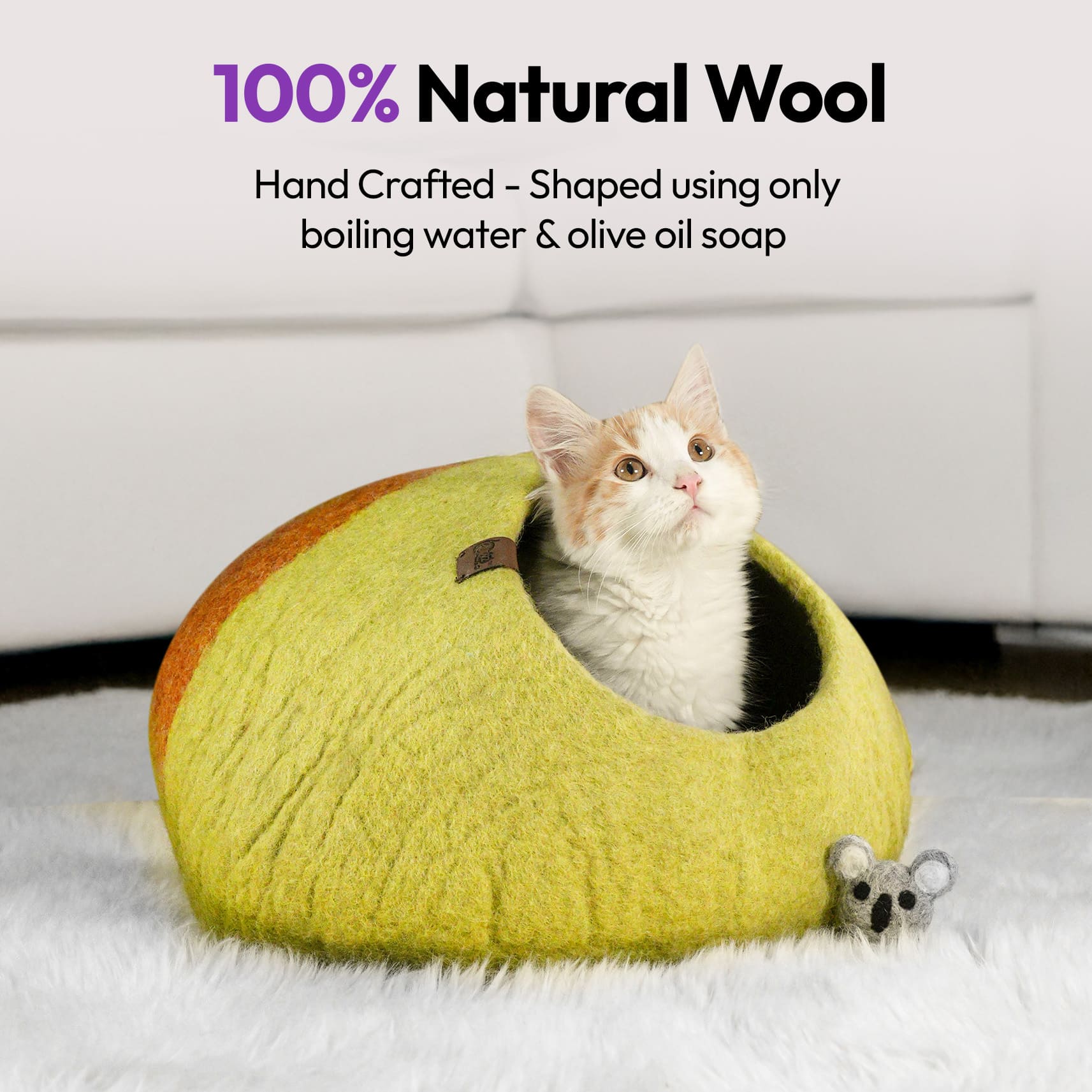 Handmade from 100% natural merino wool, this cozy, hypoallergenic cat cave offers a calming, enclosed hideaway for cats and small pets. Vet-designed to reduce anxiety and promote restful sleep, it blends modern style with sustainable craftsmanship.