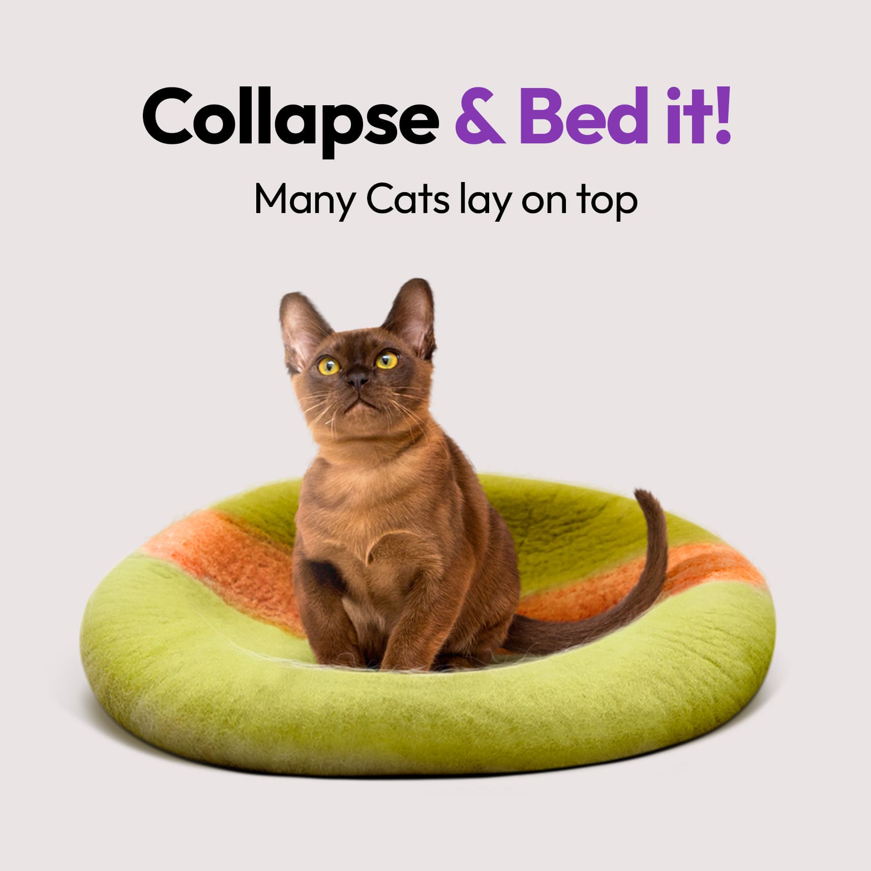 Spacious enough for most cats and small pets. Functions as a cubby, bed, igloo, play cave, or open basket when flattened.