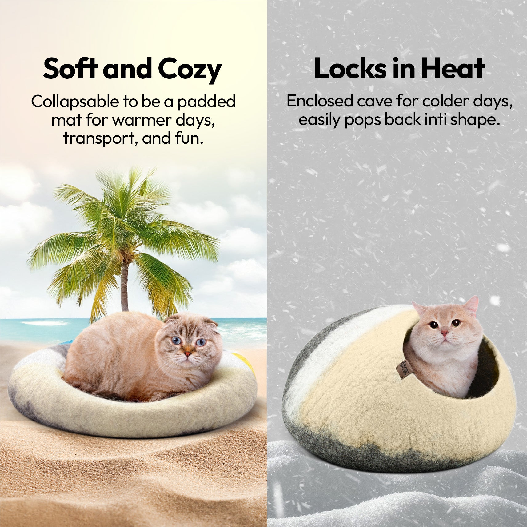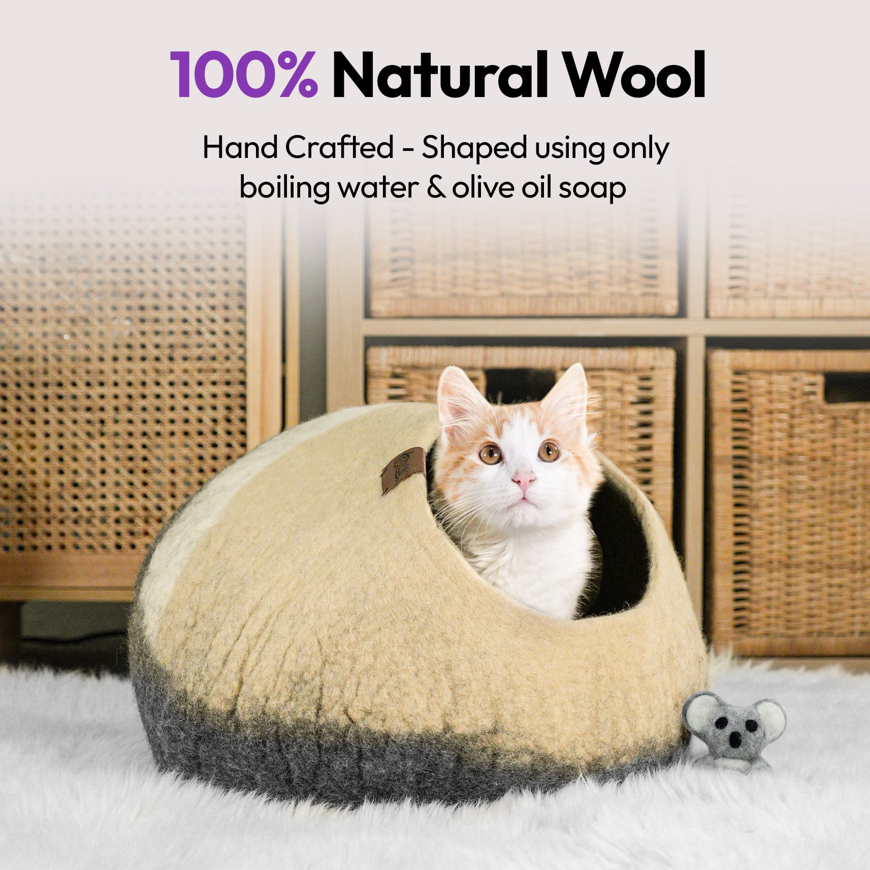 Wool keeps cats warm in winter and cool in summer—perfect for all climates and indoor environments.