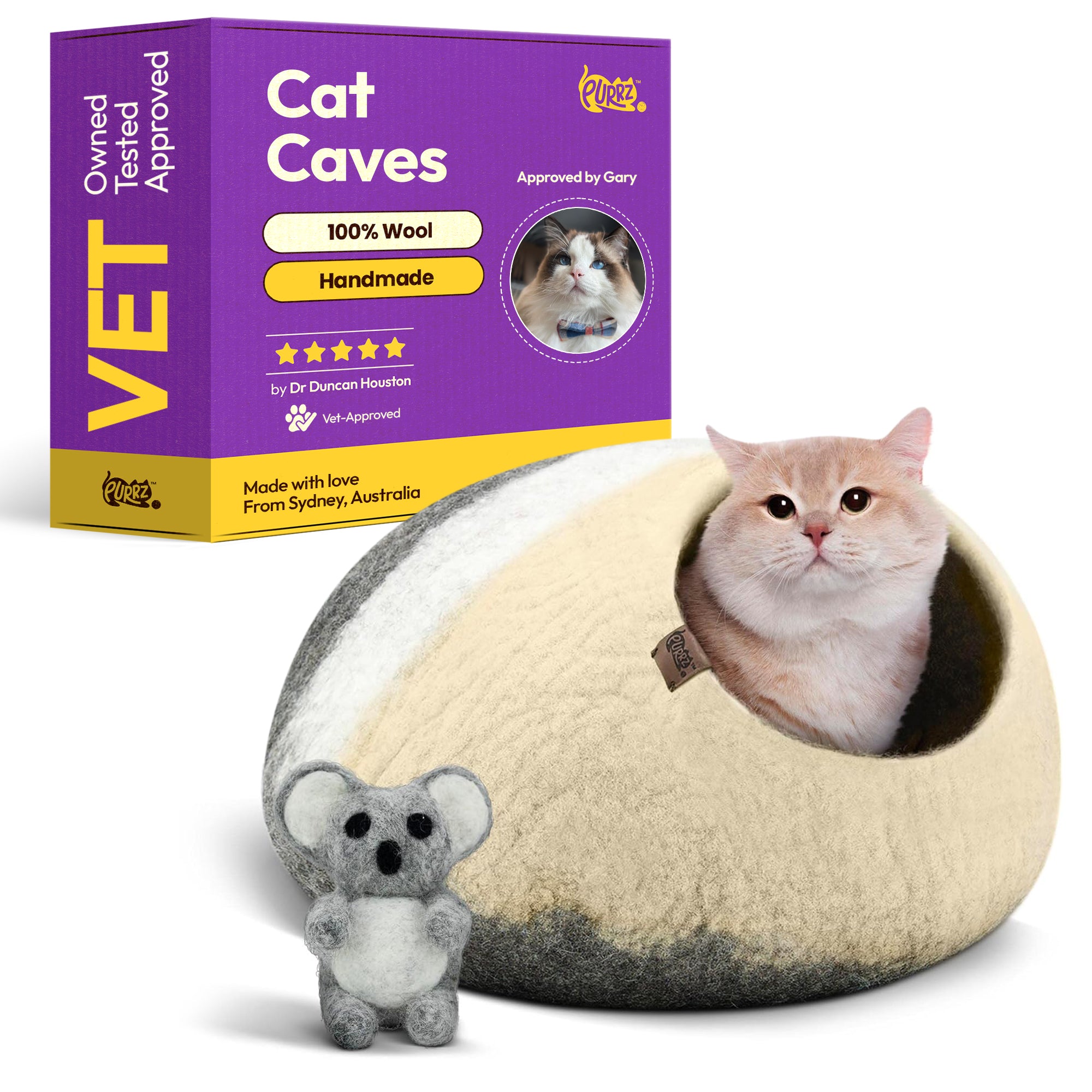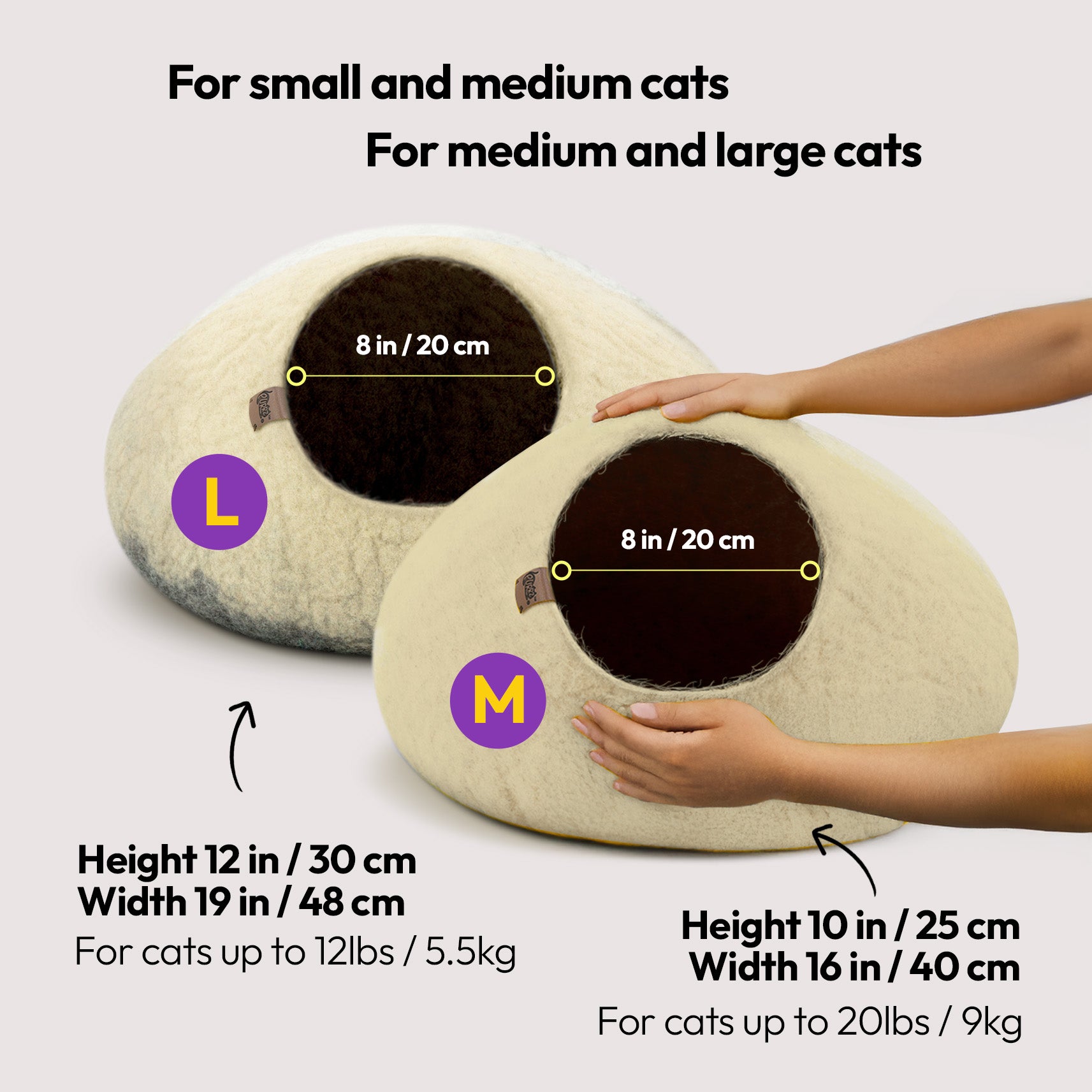 Handmade from 100% natural merino wool, this cozy, hypoallergenic cat cave offers a calming, enclosed hideaway for cats and small pets. Vet-designed to reduce anxiety and promote restful sleep, it blends modern style with sustainable craftsmanship.